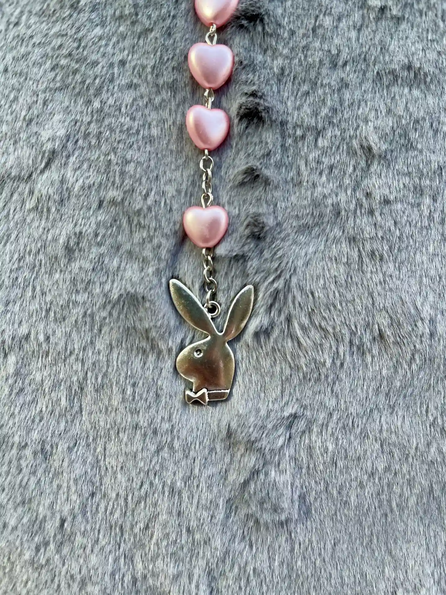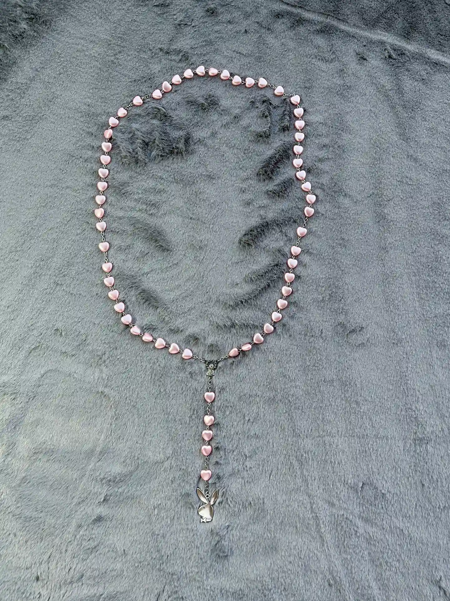 Colgante tipo rosario con estética 🐰 Playboy 🐰 ideal para darle un toque llamativo a cualquier outfit. Color: Rosa y Plateado. Cada unidad está modificada y ajustada a mano, con una longitud aproximada de 65 cm. Fabricado con una mezcla de aleación de metal y plástico para lograr un acabado ligero.